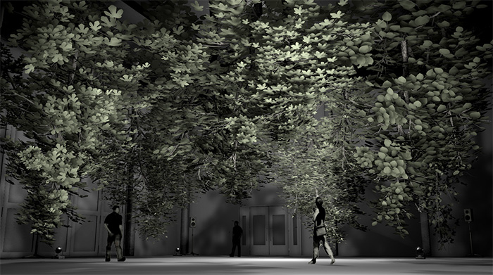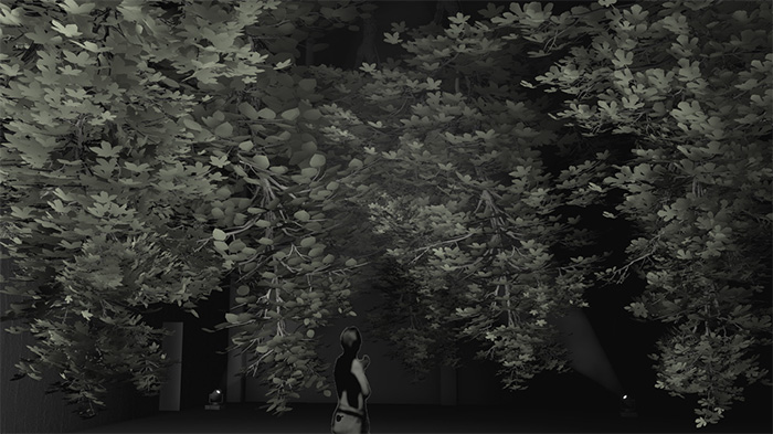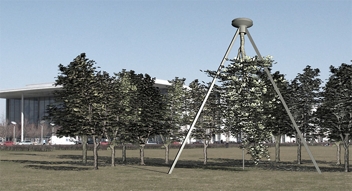The installation Hanging Forest is conceived as an international art project. Consisting of an optical and acoustic travel through time, from the symbiotic relationship between early human beings and the archaic forests, up to the crossroads of the present day.